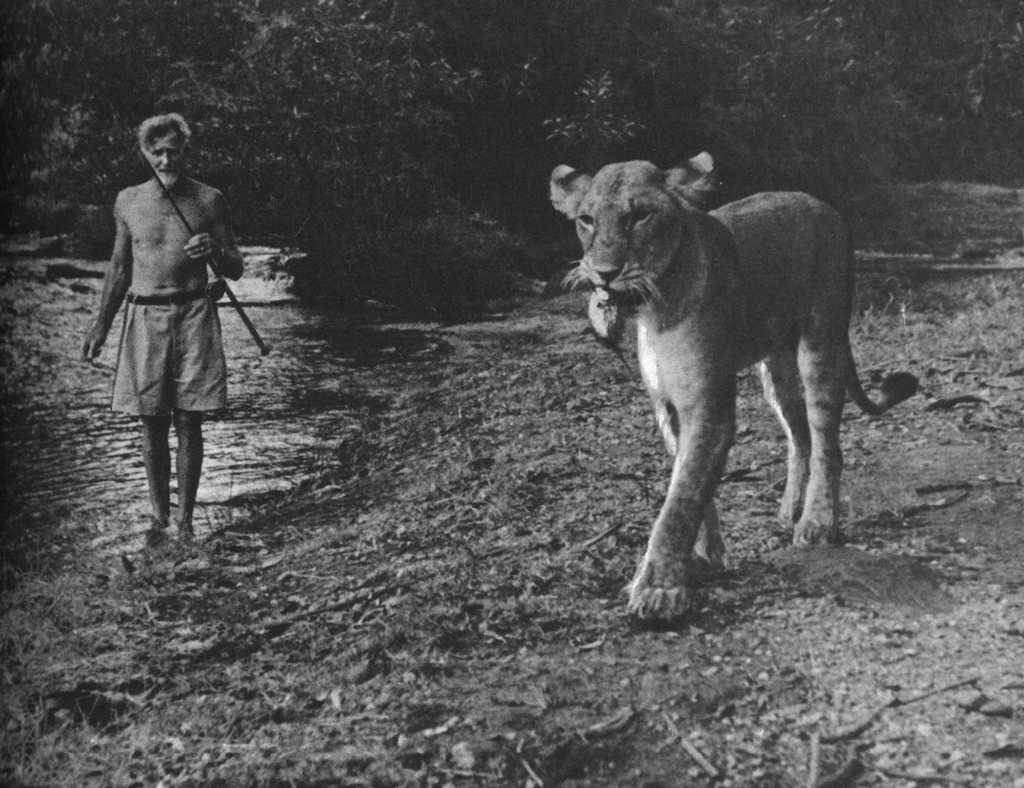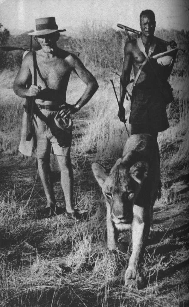 Joy Adamson and the three female cubs (seven weeks old): The 'Big One', Lustica and Elsa |